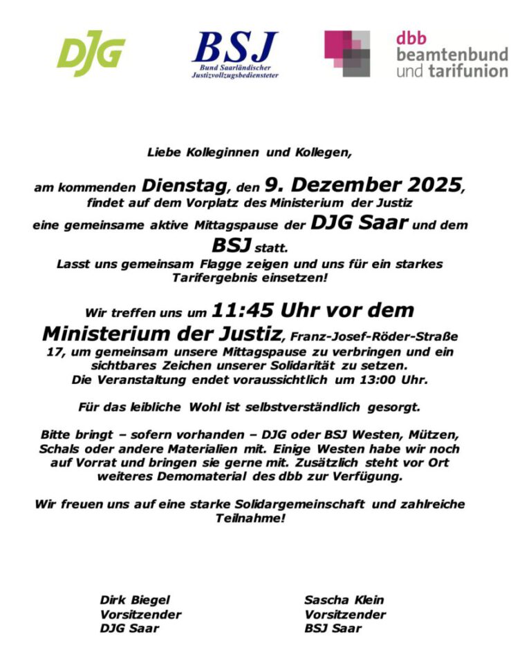 Am 28.11.2025 fand die diesjährige Jahreshauptversammlung der Deutschen Justiz-Gewerkschaft, Landesverband Saar mit Neuwahlen des Vorstandes statt. Der Landesverbandsvorsitzende Dirk Biegel begrüßte alle Anwesenden recht herzlich,